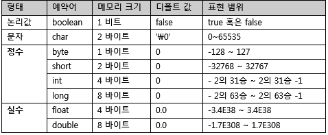 - 총 8가지의 기본형 타입(Primitive type)을 미리 정의하여 제공합니다.
